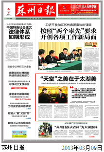 習近平對蘇州的秀美記憶猶新,“江南是個好地方,自古就有‘上有天堂,下有蘇杭’之美譽。之所以稱蘇杭為‘天堂’,不僅因為那里經濟繁榮、社會安定,‘日出江花紅勝火,春來江水綠如藍,能不憶江南’,江南美景美不勝收啊。”“美麗中國”需要和諧共建。蘇州的“四個百萬畝”工程給總書記留下了深刻印象。在最后的發言中,習近平又一次“點評”起蘇州:“蘇州‘四個百萬畝’工程提出要保護老百姓的莊稼地,水稻田就是濕地,種水稻本身也是一方美景,《紅樓夢》里大觀園中也有稻香村嘛。”習近平鼓勵說,和諧、全面是對科學發展內涵理解得更深刻的反映,希望蘇州在率先、排頭、先行的內涵中,把生態作為一個標準,為江蘇乃至全國發展作出新貢獻。