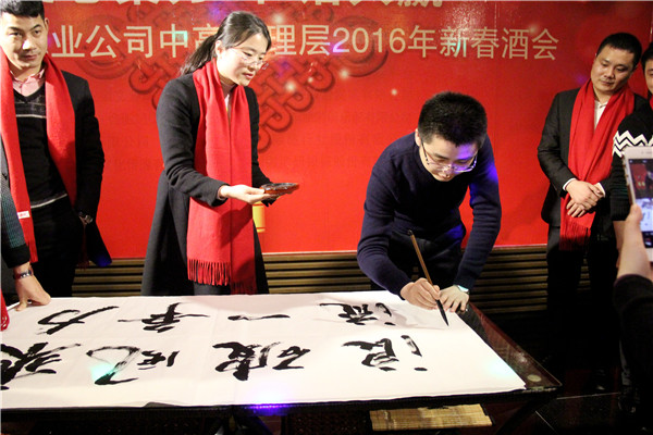 酒會上,雷鳴董事長作了重要講話,向全體中高管理層成員拜年,感謝全體成員一年來為公司發(fā)展辛苦的付出與努力,并希望新的一年大家共同努力,讓公司繼續(xù)大展宏圖、欣欣向榮。之后,各分公司、事業(yè)部、部門紛紛以創(chuàng)新、幽默、多樣的方式向全體參會人員拜年。生產(chǎn)制造中心以喜慶的春聯(lián)為依托,在表達(dá)新春祝福的同時(shí),還帶來了印有“安全第一 質(zhì)量為本”字樣的員工集體簽名橫幅,為確保產(chǎn)品質(zhì)量作出承諾;凈水家電事業(yè)部總經(jīng)理王悅生的現(xiàn)場即興題字,用丹青妙筆表達(dá)了其部門成員奮勇爭先的目標(biāo)和信心;工程事業(yè)部總經(jīng)理劉東帶領(lǐng)其部門成員所采用的“三句半”拜年方式贏得了滿堂喝彩;財(cái)務(wù)部與企劃部共同合作的“異口同聲”有獎(jiǎng)競猜創(chuàng)意拜年,更是傳達(dá)了“榮事達(dá)一家親”的美好寓意。
