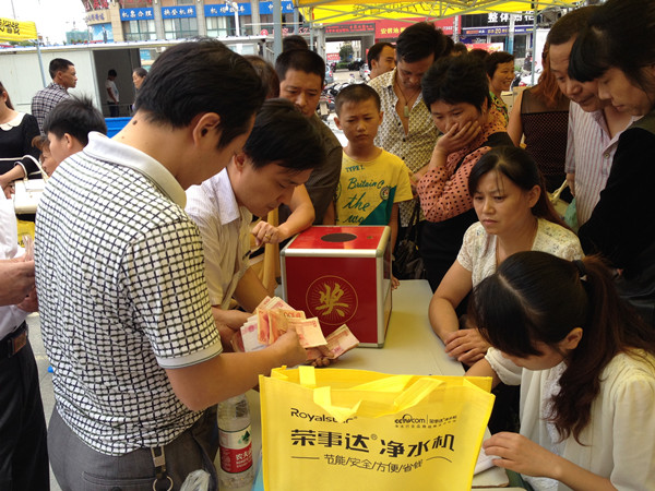 “小姑娘,我先來的,你先把我買的機子的錢收掉好讓我去抽獎,說不定我能抽一臺空調,一份錢買兩樣好東西呢”,已經挑好產品的王阿姨急切地叮囑著工作人員。活動開始后不久,收銀臺前就圍了一圈又一圈等著付款的消費者;抽獎臺前也排著等候抽取大獎的長隊,好不熱鬧。